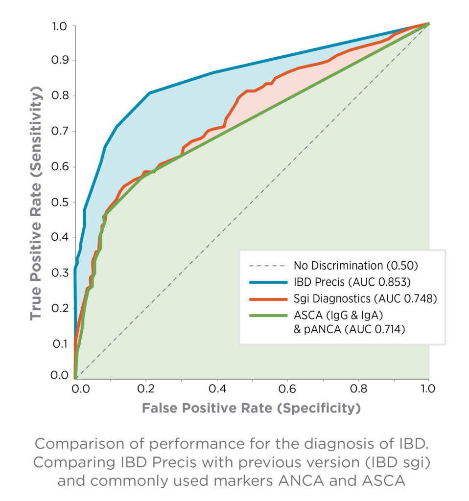 IBD Precis outperforms commonly used ANCA/ASCA markers and previous generation tests, providing the diagnostic confidence to optimize each patient’s care.1